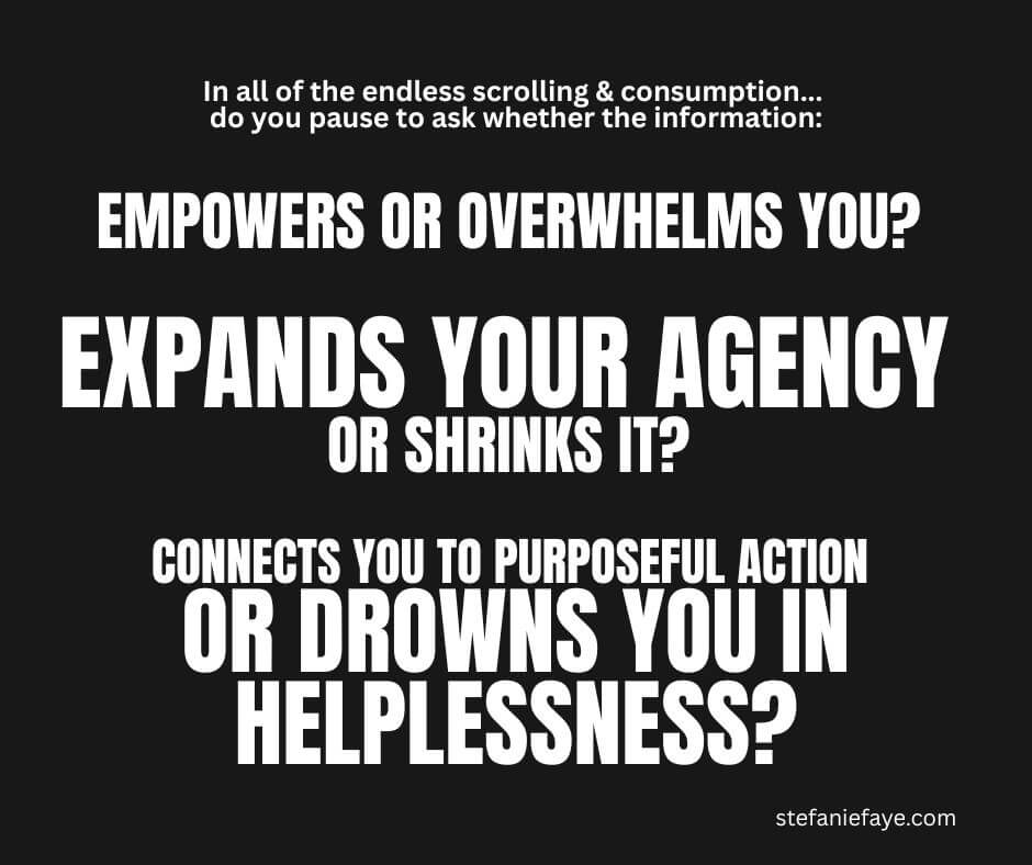 Without intentionality, information becomes just more data we can't process, leaving us feeling helpless, hopeless, and disconnected from what we can actually control.